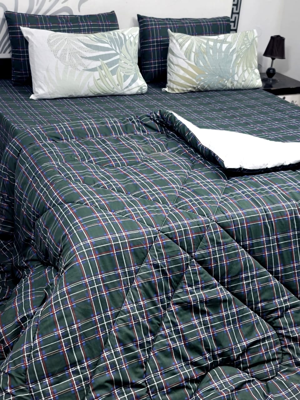 Enjoy comfort and warmth with this Pure Cotton Printed 6-Piece Vicky Razai Set. Designed for daily use and winter comfort, this complete bedding set includes a king-size bedsheet, matching pillow covers, and a quilted Vicky razai with 500 GSM filling.