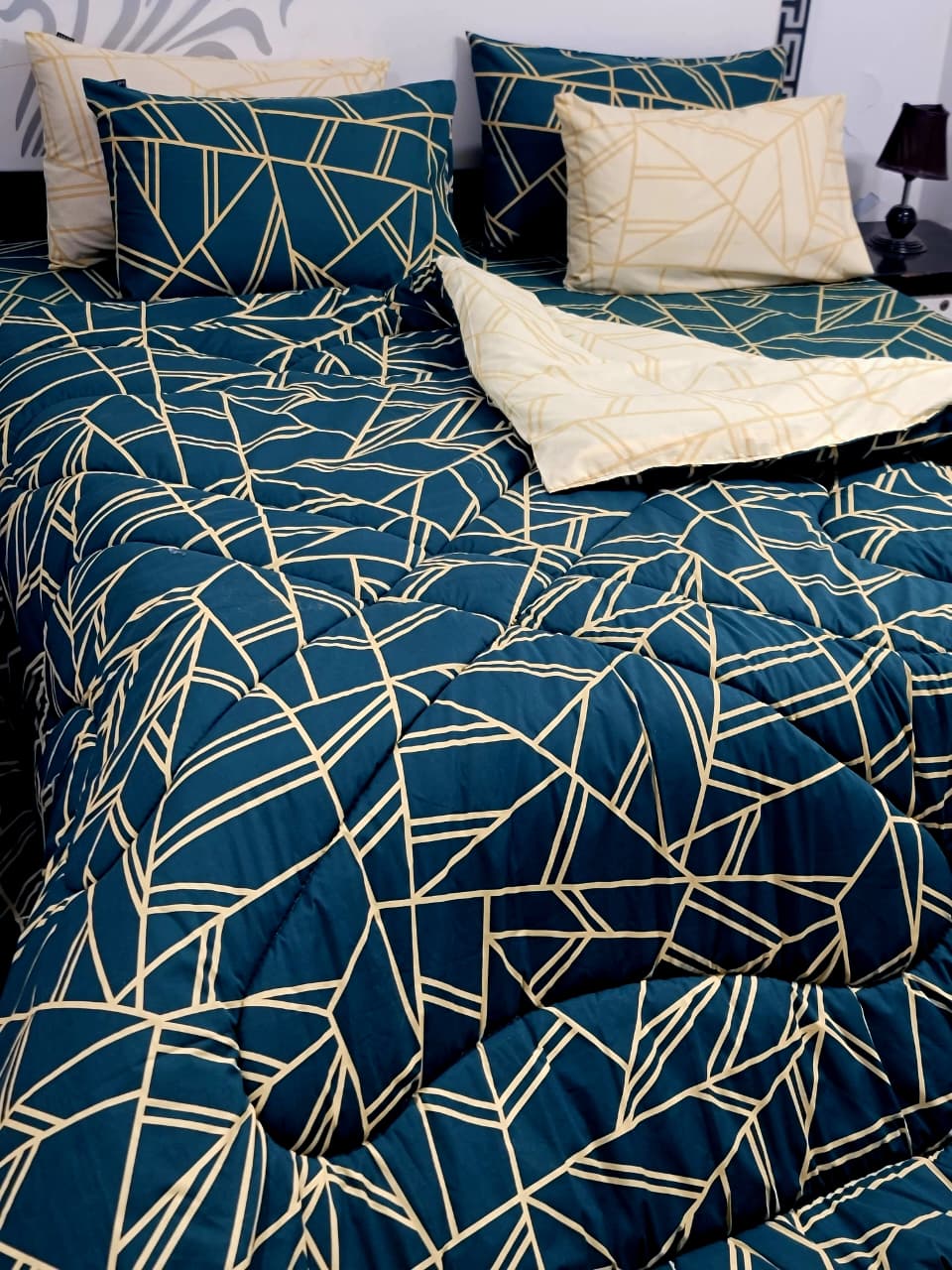 Enjoy comfort and warmth with this Pure Cotton Printed 6-Piece Vicky Razai Set. Designed for daily use and winter comfort, this complete bedding set includes a king-size bedsheet, matching pillow covers, and a quilted Vicky razai with 500 GSM filling.